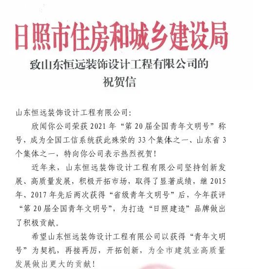 座談會(huì)上,日照市建管中心市場(chǎng)服務(wù)科科長(zhǎng)劉強(qiáng)宣讀了《致山東恒遠(yuǎn)裝飾設(shè)計(jì)工程有限公司祝賀信》。